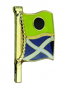 Uluslararası işaret bayrağı kodlarını kullanarak gizli anlamlar gösteren altın kaplama ve mineli rozet.