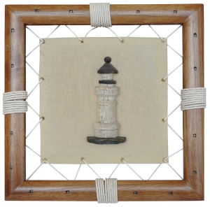 Dekoratif duvar panosu. Kumaş zemin üzerinde deniz feneri. Ahşap çerçeveli. 25x25 cm.