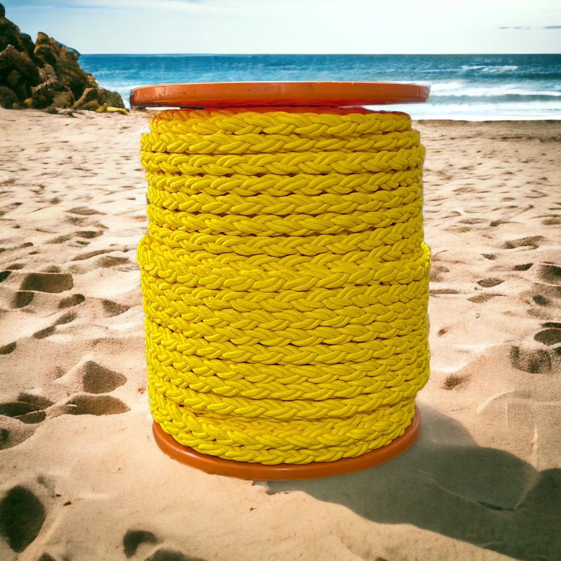 Karaya bağlanmak için yüksek görünürlüklü yüzer bağlama halatı. Polipropilen batmaz halat hafif elastiktir, böylece bir bağlama aracı görevi görür. Yüzücülere ve diğer teknelere yüksek görünürlük için sarı renkli.